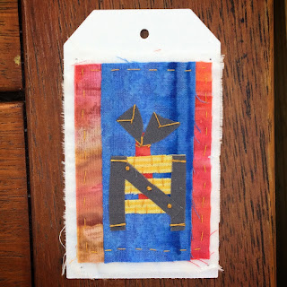 Tag 39 and the challenge was Applique. We were challenged to create this tag using pieces cut from our reverse applique tag. Again I procrastinated while I looked at the tiny pieces I would be working with. I eventually went with a simple design that could apparently be interpreted in different ways. When I shared it with some friends one saw a farm gate and another saw Napoleonic grandeur.